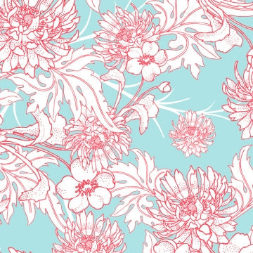 Soak in that cool ocean breeze in our Newport print! White exotic floral with red coral outlines on blue aqua.